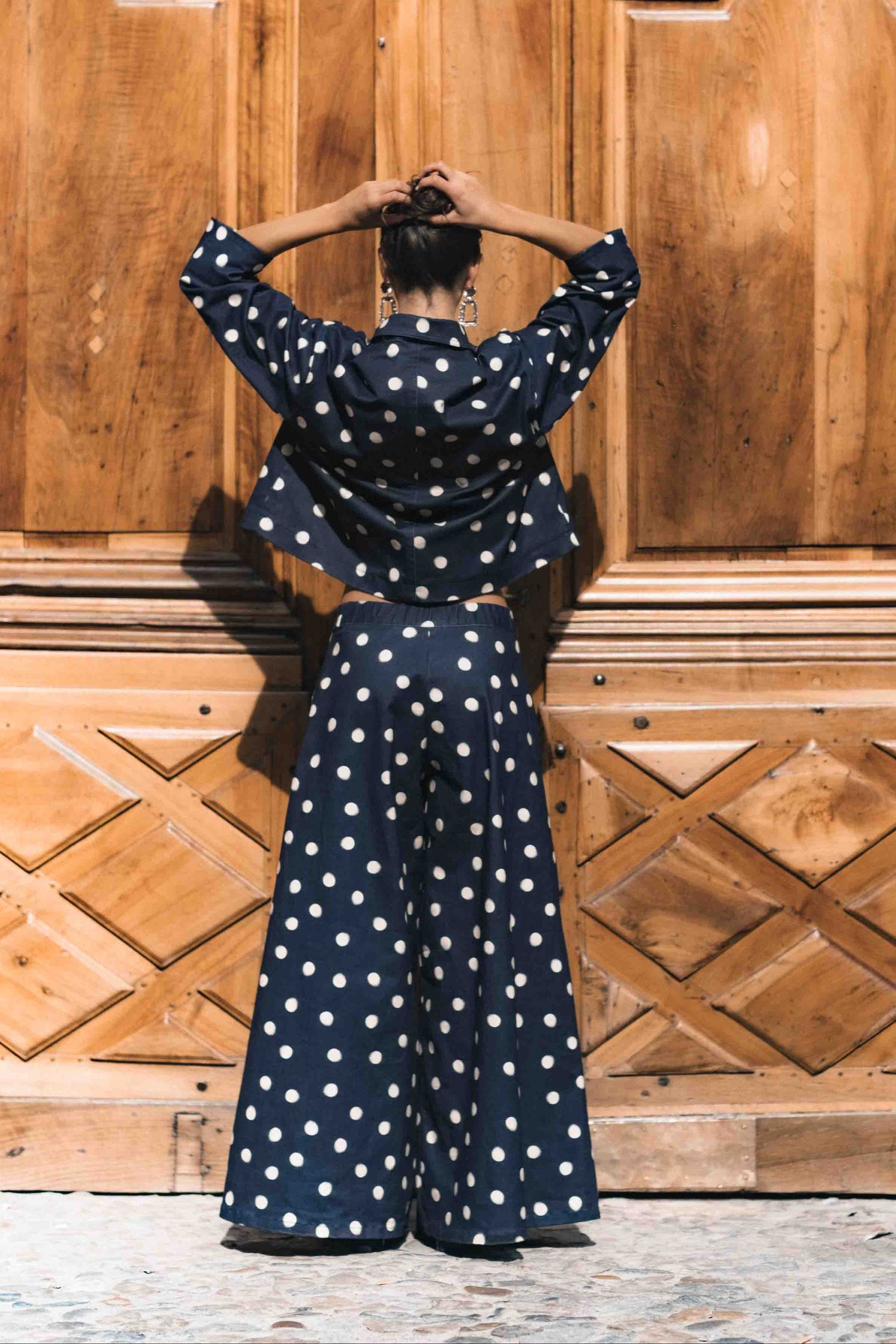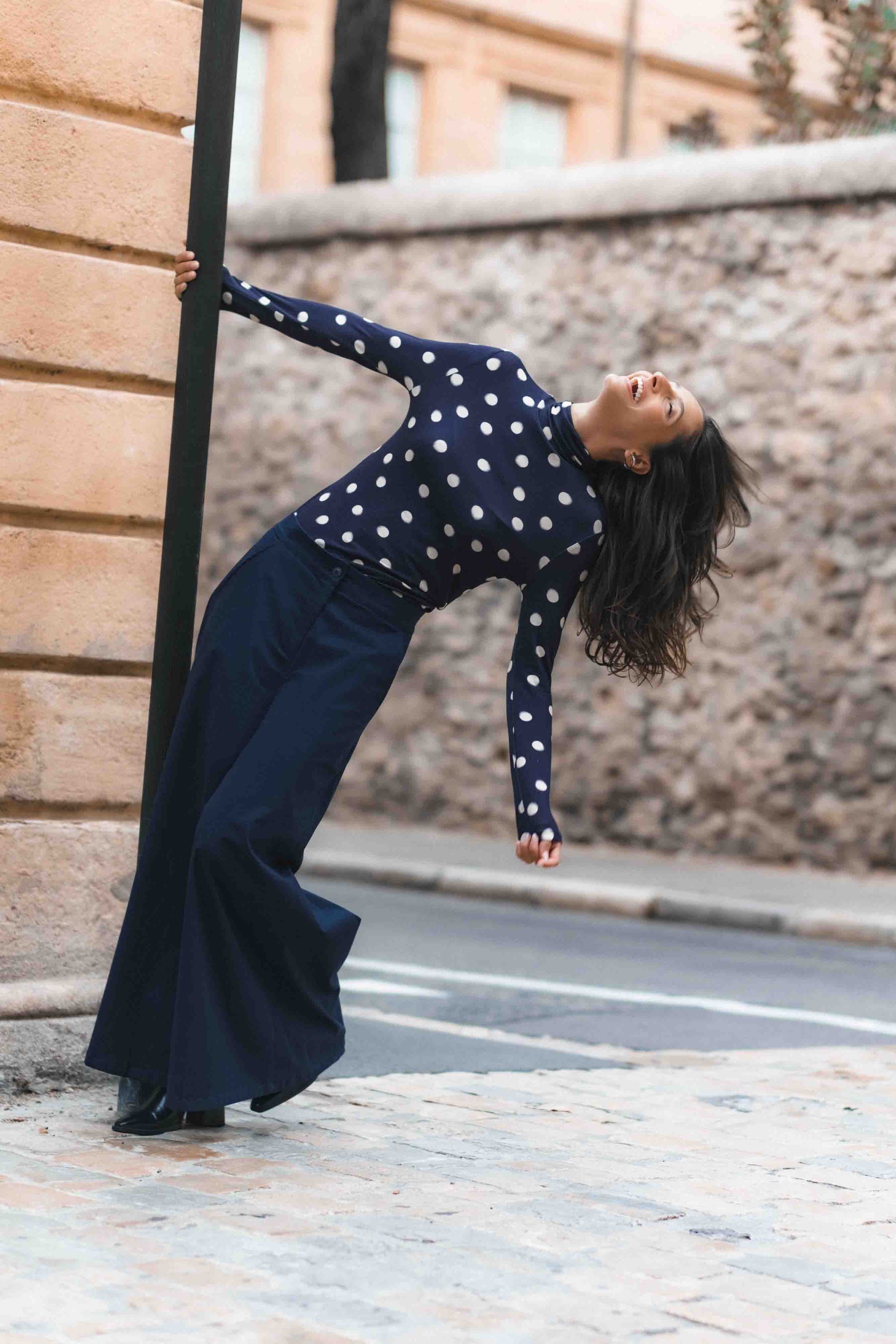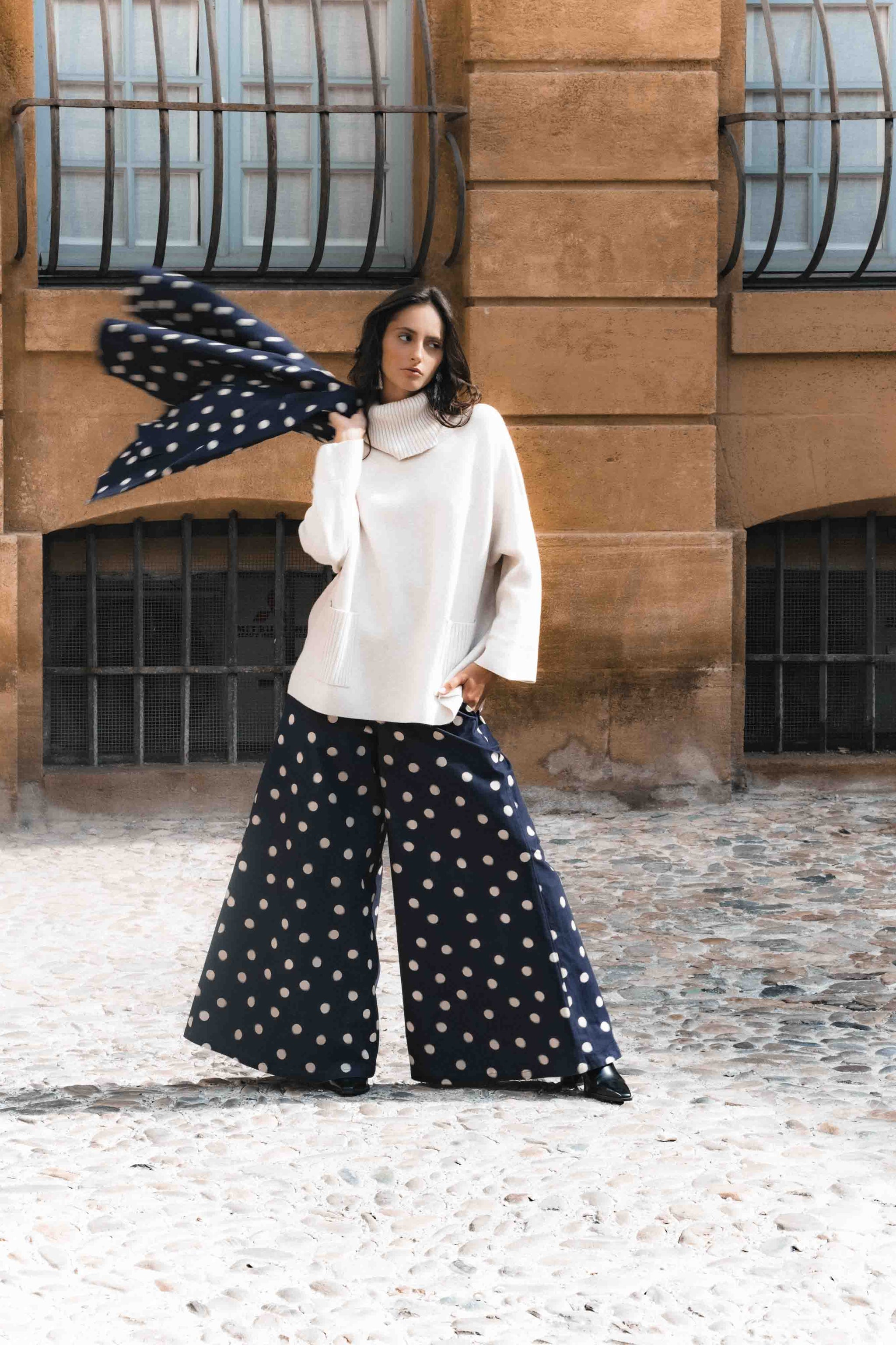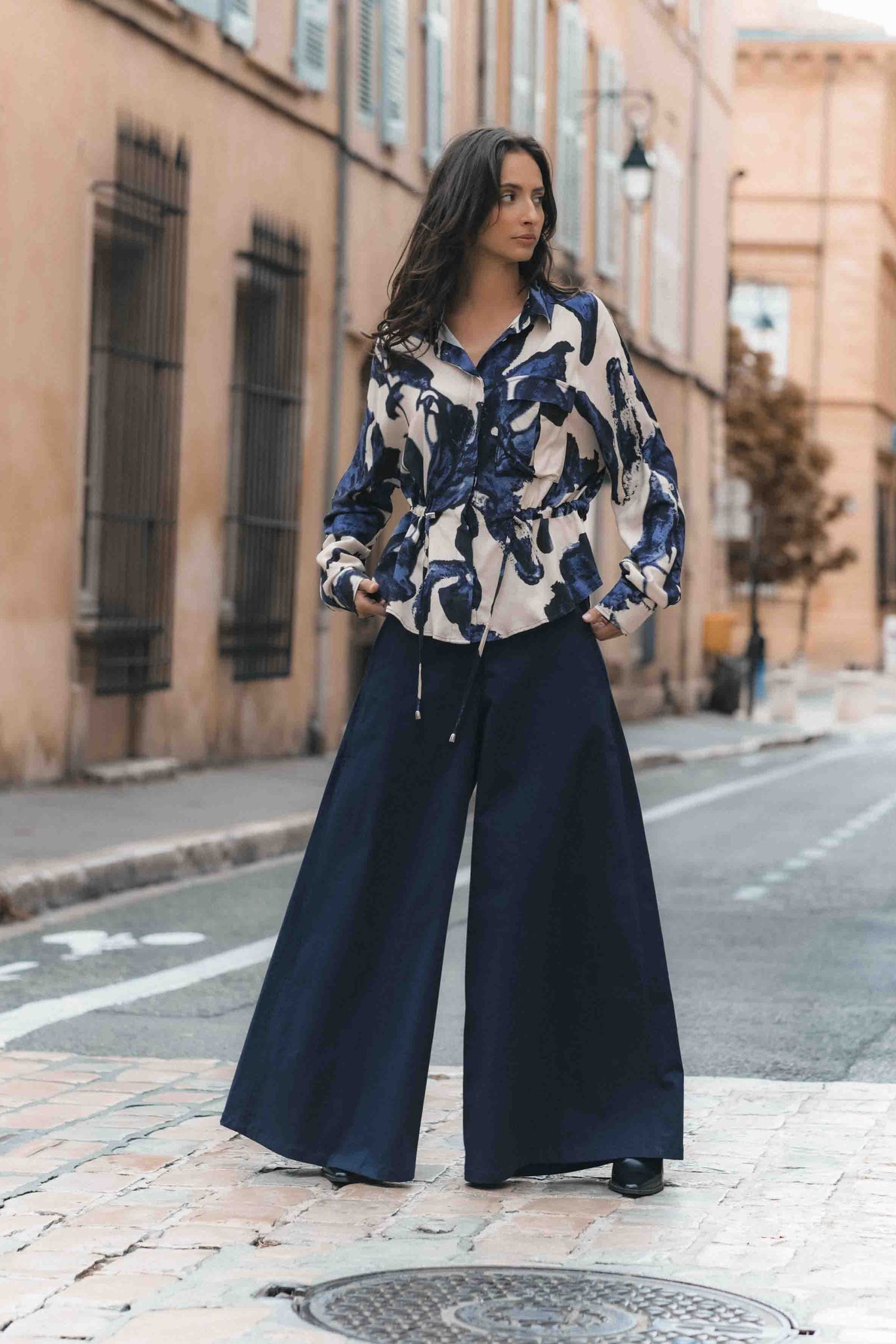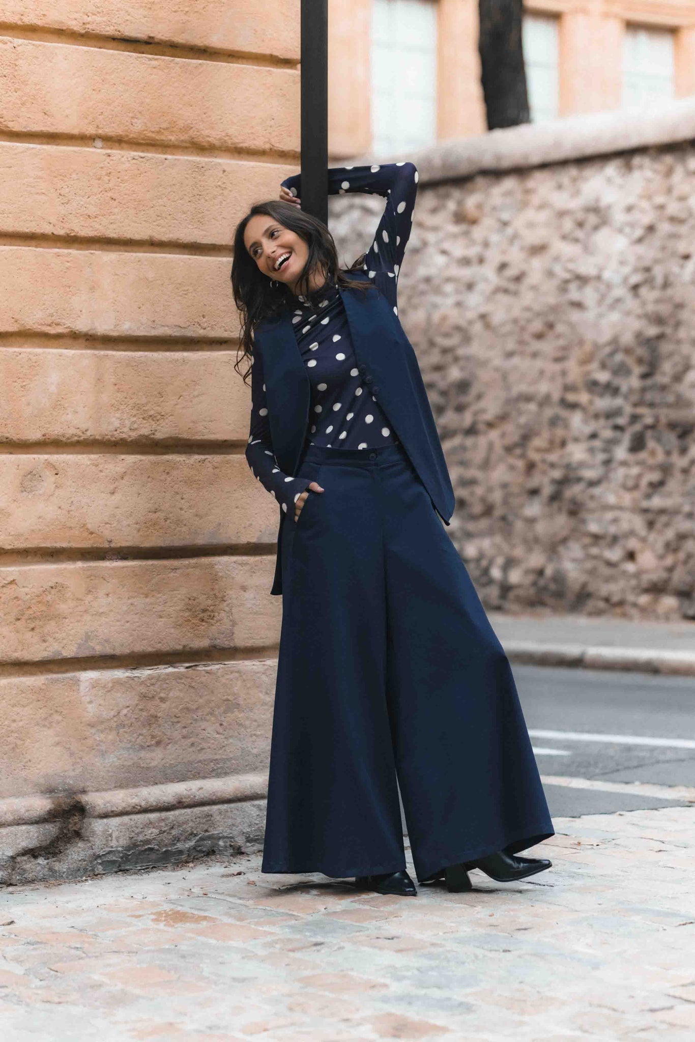 Le pantalon KAORI fait son grand retour dans deux nouvelles versions : un imprimé pois oversize, audacieux et espiègle, ou une teinte bleu marine intense, sobre et affirmée. Toujours la même coupe impeccable : taille haute, jambe extra large, tombé structuré. À porter seul ou en total look avec la veste assortie pour un effet waouh immédiat.