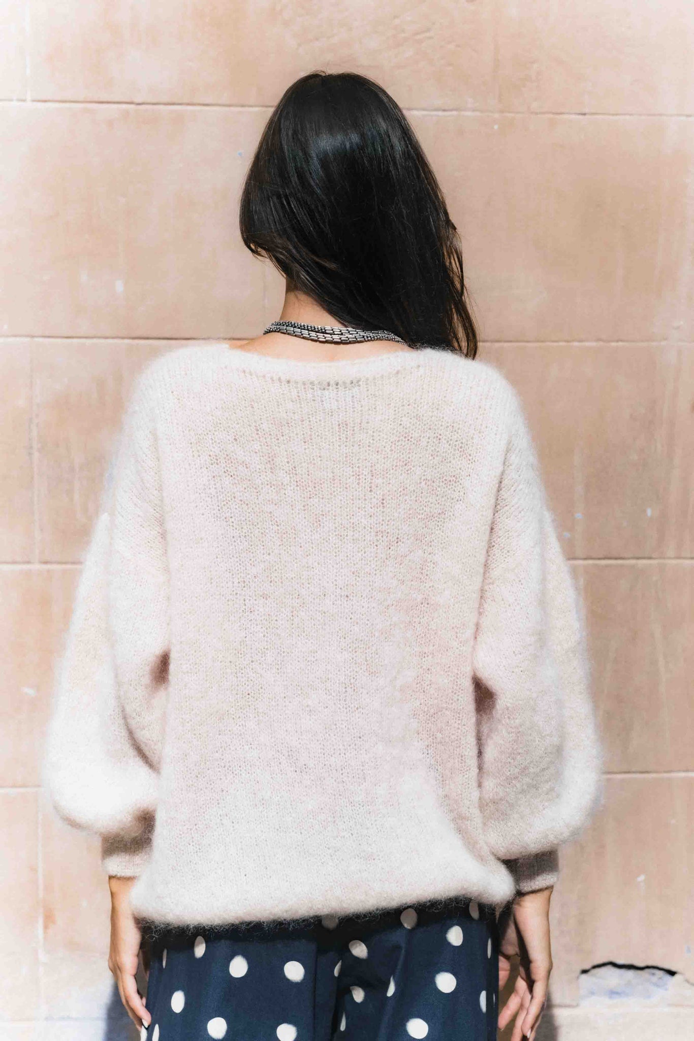 Un nuage de douceur à porter sur la peau. Avec son blanc écru subtilement teinté de rose, le pull MURMURE en mohair (70 %) joue la carte du flou et de la tendresse. Son volume est ample, ses manches légèrement bouffantes, et son col en V délicatement creusé pour souligner la nuque avec finesse. Une pièce précieuse, qui conjugue chaleur, légèreté et romantisme moderne